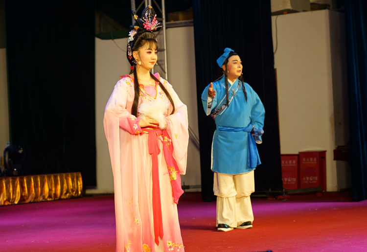 取自黃梅戲《天仙配》一折,講述了玉帝七女兒,暗戀凡夫董永,化作村姑私自下凡,要與董永結(jié)為連理,本戲為七女與董永在槐蔭樹下相遇互訴衷腸的故事。